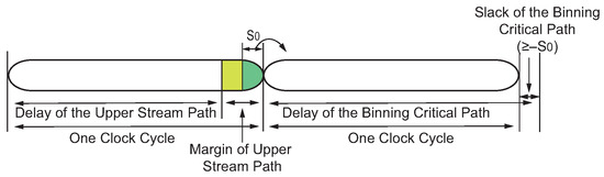 Figure 4 shows the timing of a Binning Critical Path and the margin borrowed from its upper stream path. To make the margin borrowing possible, the upper stream path should still function after lending margin to the failed Binning Critical Path. Hence, the upper stream path should have a margin larger than . Therefore, the upper stream path and Binning Critical Path could both support binning boundary frequency . It should be noted that when the upper stream path has sufficient margin, only one Binning Adaptor is needed to be inserted, as shown in Figure 5a. However, sometimes, the timing margin of the upper stream path does not meet this requirement. Then, multiple Binning Adaptors are needed, as shown in Figure 5b. Binning Adaptor I is inserted into the launch flip-flop of the Binning Critical Path and Binning Adaptor II is inserted into the launch flip-flop of the upper stream path. The Binning Adaptor II keeps borrowing extra slack from the higher upper stream path (), which ensures that the upper stream path () has an abundant margin to lend to the binning critical path. In addition, if the timing margin of both and is less than , then should be reduced.