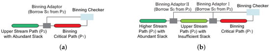 The insertion of Binning Adaptor under two different scenarios. (a) The upper stream path of the Binning Critical Path has a slack larger than . Then only one Binning Adaptor is needed; (b) The upper stream path of the Binning Critical Path has a slack smaller than . Hence multiple Binning Adaptors are inserted.