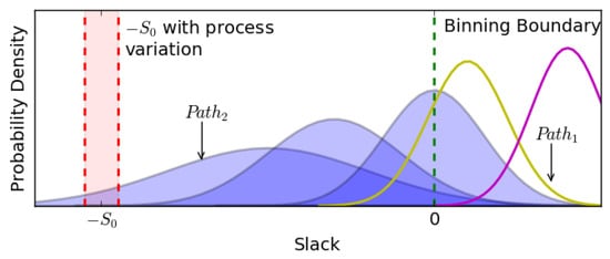 The bin promotion may not be successful for all devices. Figure 6 shows the silicon delay distributions of all speed-paths of a device, which can be binned at . In other words, all speed-paths should have a probability of locating on the right side of the binning boundary. However, some Gaussian curves almost fully locate on the right side of the binning boundary, which represents the paths with little probability of causing binning failure at . Meanwhile, the other Gaussian curves have a non-negligible part locating on the left side of the binning boundary, which represents the paths causing binning failure frequently. The shaded Gaussian curves in Figure 6 represent the selected Binning Critical Paths, and the boundary marks the adaptability of Binning Adaptor with process variations.
