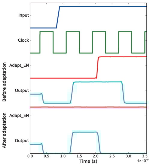 To verify the proposed Binning Checker and Binning Adaptor, both are inserted into a b19 Binning Critical Path with a delay of 851 ps. The preset adaptable margin () is 23 ps, and the slack of the upper stream path is 50 ps. The Spice model of the Binning Critical Path together with the attached Binning Checker and Binning Adaptor are extracted from the design layout. A stimulus pattern with a rising edge is applied at the launch flip-flops of the critical path. The clock frequency is set to 1.19 GHz, and its period is smaller than the delay of the critical path. As shown in Figure 8, before adaptation, at the first capture, the path fails to make transition, which represents a 1.19 GHz binning failure. At the same time, the Binning Checker identifies that the monitored path is an adaptable Binning Critical Path, and it switches Adapt_EN to 1, which initiates the adaptation. Thus, the same path functions again at the second capture, which means the path meets the 1.19 GHz binning frequency. The waveforms after adaptation in Figure 8 represent the case when the adaptation status of the specific path has been written into a directly accessible flash memory and applied to the path right after power up or rebooting. Then, when the same patterns are re-applied to path, the path always functions correctly at 1.19 GHz frequency.