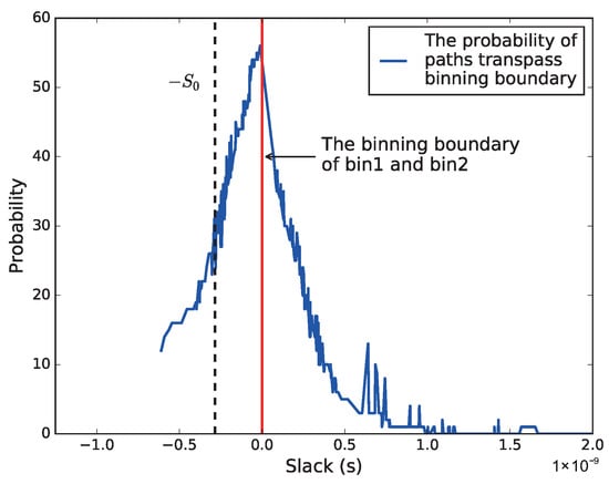 Figure 11 shows the average slack of the b19’s top 20% paths at and their corresponding probability of transpassing the bin boundary. For example, for the paths with average slack smaller than 0, the y-axis represents the probability of the path locating in the higher bin (). While for the paths with average slack larger than 0, the y-axis represents the probability of the path falling to the lower bin. Hence, if we make the Binning Critical Path selection criteria as 70% (with a probability of dropping to the lower bin, and a probability of 1− = 30% staying in the bin), then the ideal adaptable margin can be decided, as shown in Figure 11. Hence, the and inside the Binning Checker and Binning Adaptor in Figure 2 can be selected accordingly.