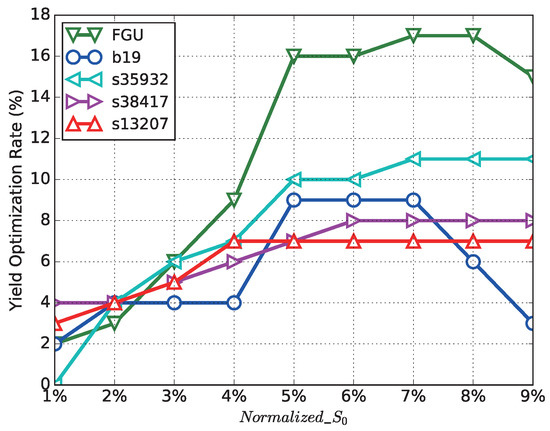 As discussed above, the decision of adaptable margin , which is the timing margin borrowed from the upper stream path of a timing critical path, also affects the Yield Optimization Rate. To analyze ’s impact, we introduce defined in Formula (2), where is the functional clock cycle length. It seems that the larger the is, the more binning failure paths can be recovered. However, Figure 13 shows the Yield Optimization Rate through increasing . It can be seen that at the beginning, with the increment of , the Yield Optimization Rate improves. However, as the timing margin of upper stream path is restricted, cannot keep increasing. A too-aggressive fails the upper stream path. Take b19 for example, as shown in the same figure, with increased to 6%, the Yield Optimization Rate starts to decrease. Therefore, for this implementation, it is suitable to set the value of to 5%.