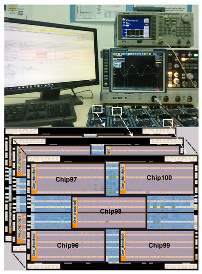 To mimic the actual speed binning scenario, the proposed binning adaptation system has been implemented on a number of FPGAs. The technology of the adopted FPGA is 28 nm, which has enough process variations. Each FPGA represents one or multiple benchmarks depending on the size of the implemented benchmark. The layout and measurement setup of FPGAs are shown in Figure 14. The chips will be projected into three bins according to their test results.