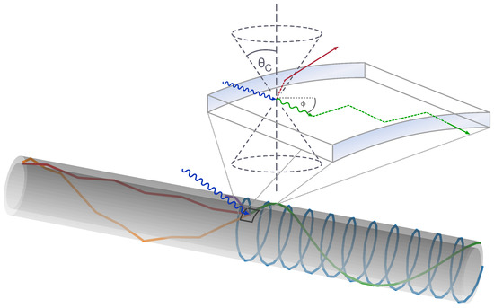 While the general working principle of the WOM is similar to that of a wavelength-shifting fiber, the different geometry makes a noteworthy difference in the fraction of photons that can be captured by total internal reflection. Following a purely geometrical argument, there is no difference between a hollow tube and a solid cylinder, as for any photon trajectory, the incidence angle on the inner surface of a hollow tube will always be larger than the incidence angle on the outer surface. Total internal reflection in the first interaction on the outer surface is thus a fully sufficient criterion to determine whether a photon is captured and guided along the tube. In a full cylinder, the no-curvature approximation no longer applies, and Equation (3) needs to be generalized to