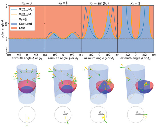 Illustration of the solid angle under which the photons are captured as a function of the relative fraction of the radius at which the photons are emitted (indicated by the yellow dot). The orange (blue) line in the upper plot indicates photons that encounter the surface under the critical angle as a function of the azimuth angle () relative to the emission point (center of the cylinder). In the upper and middle plots, the blue shaded areas indicate solid angle regions under which photon trajectories are captured by total internal reflection, while red shaded areas show those that are not captured. In the middle plot, yellow arrows indicate directions of incident photons, while green arrows depict surface normals. In this example, the critical angle is chosen as .