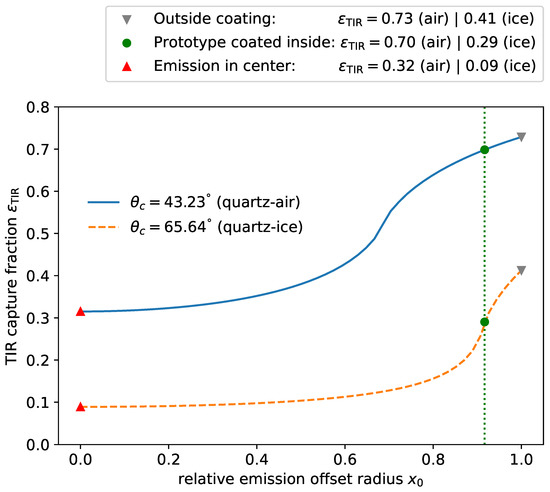 - Coating on the inside shifts the light emission point towards the center, resulting in a reduced capture efficiency, as discussed in Section 2.1. The performance loss will increase with the thickness of the tube and the refractive index of the environment in which the coated tube is deployed.