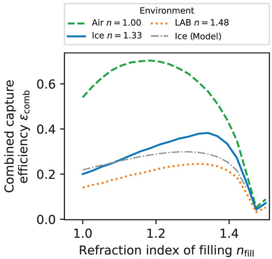 Therefore, in order to find the optimal refractive index of the filling material for the prototype geometry, the cylindrical geometry of the WOM is modeled in an MC simulation (in this ray-tracing algorithm, which was written in Python, photons start from a rectangular plane that is uniformly rotated around the WOM; the photons are propagated through the WOM surfaces, taking Fresnel losses and angular changes via Snell’s law into account; the number of photons captured by total inner reflection are counted and divided by the total number of photons, as well as the area of the generation plane, to get the combined capture efficiency), propagating incident photons with Fresnel equations and Snell’s law in three dimensions. The wavelength dependence of the refractive indices is negligible, and it is assumed that all refractive indices are fixed at a wavelength of . The capture efficiency derived from this simulation is shown in Figure 5 and compared to the co-planar model. The optimal refractive index of the filling increases with larger refractive indices of the environment to a maximum at with for water and ice. For water and ice, the filling could be ethanol or methanol, which have the disadvantage that they dissolve the WLS paint, or perfluoropolyether (PFPE), which is comparatively expensive.