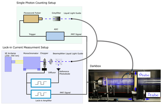 The monochromatic beam is chopped to allow for a signal readout via a lock-in amplifier [17]. The chopper frequency is fed into two lock-in amplifiers, which demodulate a PMT signal. Subsequently, the light passes a diffusor, which shapes the beam to a homogeneous Gaussian profile. The beam is split up by a beam splitter. The reflected fraction of the beam illuminates a reference photodiode [18] to correct for lamp intensity variations, while the transmitted fraction is guided into a dark box to illuminate a WLS tube using a liquid light guide [19]. The end of the light guide in the dark box can be moved along the symmetry axis (the position) and the azimuthal angle (note that this is a different definition from that of the variable in the flattened model in Equation (5)). The size of the illumination spot is around 1 cm in diameter. Thereby, selected points in and on the tube surface can be illuminated to determine the local efficiency. The light is detected at both tube ends using PMTs [11]. The PMT surface is described in polar coordinates with the radius r and the angle .