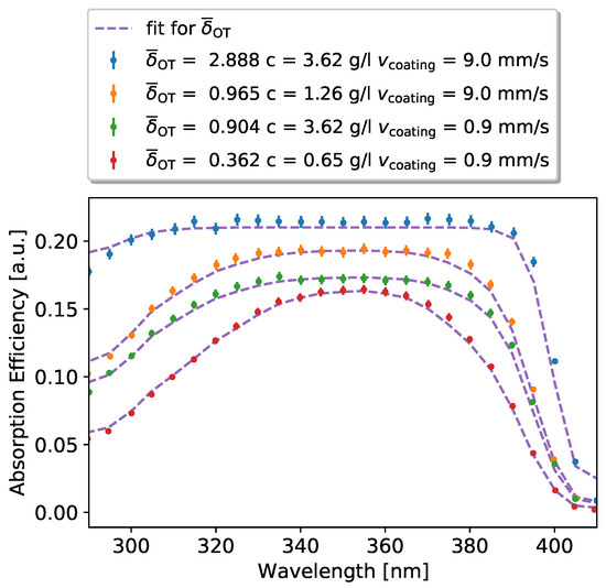 In Figure 8, the effects of the variation of coating velocity and concentration of the wavelength shifter Bis-MBS on the absorption of the paint layer as a function of the wavelength are shown. To verify that the absorption efficiency follows Equation (7), we use the dependency from the lowest absorption curve to estimate the optical depth for the other coating speeds and concentrations. The fit and data values are in good agreement. Comparing the different variations, it can be observed that high paint layer thicknesses lead to an overall broadening of the absorption spectrum up to a maximum where all incident photons are absorbed. In this way, the absorptive properties of the WLS paint can be optimized.