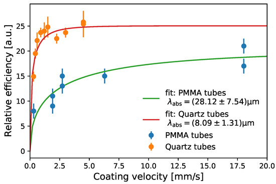 In Figure 9, the relative light yield of PMTs at the end faces of quartz and PMMA tubes coated on the outside is shown as a function of the coating velocity. The incident light has a wavelength of 375 nm. For quartz, the same tube was coated and measured, and the coating was removed again. This procedure was repeated at different velocities and twice for the highest velocity. For PMMA tubes, the coating could not be removed, so a different individual PMMA tube was coated for each measurement. As soon as nearly complete absorption of the injected light is achieved, a further increase in the coating thickness yields no further increase in efficiency. For the highest velocity, the two efficiencies obtained in the two coatings of quartz glass differ by significantly less than the measurement error, indicating that the coating process is well reproducible. In comparison, the results achieved for PMMA tubes show a larger spread and significantly lower efficiency values (see Figure 9), indicating a less reliable coating process. The larger value simultaneously obtained for the absorption length for incident light possibly suggests that the tube surface is partly dissolved by the toluene in the coating process, thus locally diluting the wavelength-shifter concentration.