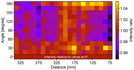 In Figure 10, a measured relative efficiency over half the surface of a quartz tube is shown. The current is measured in steps of in azimuth angle and 10 mm in a cylinder of height z. The intensity value at a given position z is divided by the corresponding value at . In conclusion, an overall relative variation of the paint layer efficiency of ±5% was obtained.