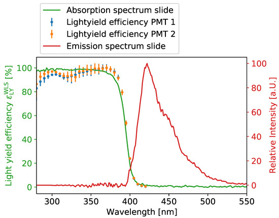 Absorption (green) and emission spectra (red) of a WLS-coated quartz slide. The light yield efficiency measured on the prototype tube is shown in blue and orange. The methodologies of the experiments are described in Refs. [24,32].
