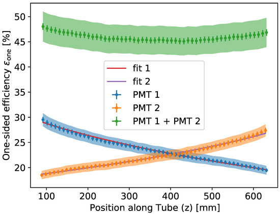 In the absence of light reflected from the other end of the tube, the efficiency measured with the test stand described in Section 3.1 can be be identified with the one-sided efficiency in Equation (5). The efficiency of the WOM as a function of the z-position is determined using the lock-in setup (Equation (8)) and the single-photon setup (Equation (9)) independently for the same WLS tube. The results of both measurements overlap within their respective uncertainties. In Figure 12, the measured efficiency is shown as a function of the cylinder height z obtained for the 700 mm long, 60 mm outer diameter prototype quartz tube described in Section 1. The tube was coated on the inside at a speed of 25 mm s−1. Using the obtained efficiency as a function of the distance z, the flattened model (see Section 2.2) was used as a fit function in conjunction with a normalization constant N as an additional fit parameter. The constant N accounts for light losses independently of the position along the tube z.