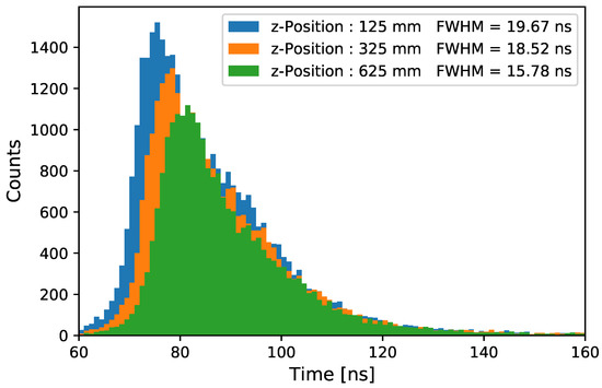 Using the single-photon setup described in Section 3.1, the transit time spread of photon coupling into the WLS tube is measured as a function of the distance to the PMT z. Here, the arrival time of each individual photon is calculated as the first bin in which the recorded waveform amplitude reaches half of the peak amplitude in the photon event (constant fraction discriminator). The transit time spread is the distribution of the individual arrival times. Measurements were taken on a 900 mm long outside-coated PMMA tube in increasing distance between the PMT and light entry point. The light pulser [21] had a full width at half maximum (FWHM) of ns, and the sampling time step of the ADC digitizing the PMT output was 1 ns. The time resolution of the WOM is a convolution of three effects [37]: