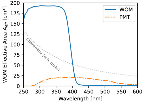 In the evaluated design, the effective area of the WOM exceeds the effective area of the single PMT by a factor of approximately in ice and in air. The wavelength-dependent effective area of the WOM and a single PMT is shown in Figure 14. The Cherenkov spectrum (without attenuation in medium) is shown in parallel to illustrate the advantage of an enhanced sensitivity at a lower wavelength. The ratio of the average effective area improves to a factor of approximately in ice and when weighted with the Cherenkov spectrum.