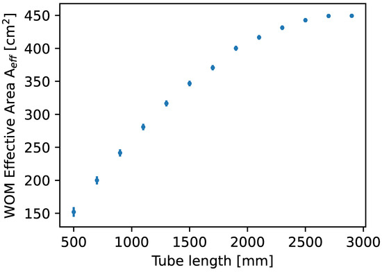 The effective area scales linearly with the diameter of the tube. The scaling of the effective area in dependence on the WOM length saturates due to the attenuation of photons during propagation in the tube, as shown in Figure 15. In reality, the dimensions are further restricted by several limitations: The dip-coating station would need to be scaled; glass tubes of appropriate quality are limited in diameter due to manufacturability; the high weight and bulkiness of the device complicate handling in the laboratory and during deployment.
