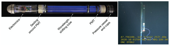 A demonstrator device made in the prototype configuration and photographed under UV illumination (left). The electronics comprise a PMT pulse readout, environmental sensors, and communication. After deployment, a photograph was taken by a robot in the Ocean Network Canada. (right). Right picture: Courtesy of the ONC.