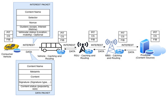 The features of the ICN architecture make it a promising solution to fit the peculiarities and requirements of the IoV environment. One of the most important and helpful features of ICN is in-network caching, which allows users to acquire data from nearby servers to reduce latency. In this context, we leverage the Interest and data packets of ICN. The Consumer Vehicle (CV) sends an interest packet to get content, which might be cached on connected RSUs or MBS within its radio range, or otherwise located on a remote server. Edge Nodes that receive the interest packet and have the requested content in its caching storage deliver the data packets (content) to the CV. RSUs have the capability to serve multiple vehicles using their limited storage cache space. Each RSU and routing vehicle (RV) should exploit its limited resources (memory, CPU, cache space, …) proactively to provide optimal services.