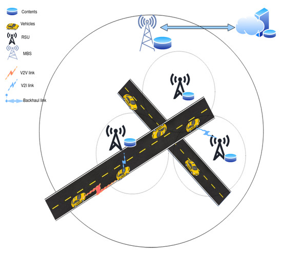 In this study we consider an urban scenario that encompasses IoV, RSUs equipped with a wireless interface and storage, Cellular Macro Base Stations (MBSs), and a remote cloud center as shown in Figure 2 in the context of ICN networks. We assume that vehicles are communicating with RSU through V2I links and also with other vehicles through V2V.