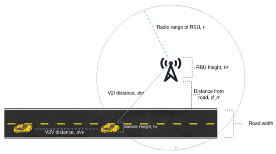 It can be seen that at , the vehicle is just entering the coverage area and is at a distance r from the RSU, while at the vehicle is leaving the coverage area, situated again at a distance r, for the vehicle is outside the coverage of the RSU.