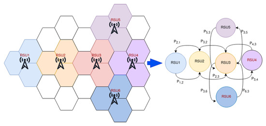 The Markov model can be represented either as a graph or as a transition matrix. The mobility of the vehicle and its connection with RV or RSU can be modeled using a Markov process [22] as shown in Figure 4.