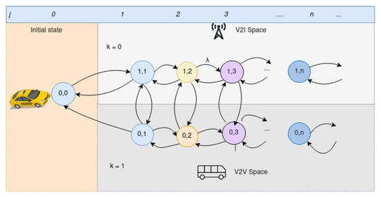 Let denote the probability that request j is served by the network connection for connection with V2I and for connection with V2V. The network states in Figure 5 can shift from to and vice versa depending on the current network performance.