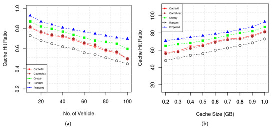 (a) Cache Hit ratio vs. No. of vehicles (b) Cache hit ratio vs. different cache size.