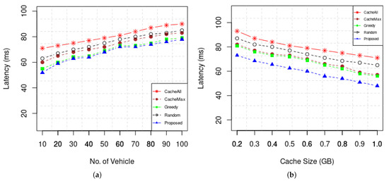 (a) Latency of caching vs. Number of vehicles (b) Latency vs. Cache Size.