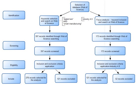 In order to obtain the final samples to analyze, we first began by choosing the keywords needed to conduct the search in the platform ISI Web of Science. The keywords chosen were digital twin and smart manufacturing. In the search field we used ”digital twin ”AND” smart manufacturing”, thus obtaining 397 documents. Second, since we wanted to focus also on Industry 4.0, we added a more specific search where we used the three keywords connected by ”AND”. This search yielded 173 results.
