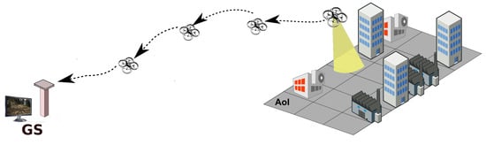 The versatility of unmanned aerial vehicles (UAV or drones) has allowed their use for multiple purposes, either recreational, engineering, scientific, or military. Many of these applications require remote vision, either for their own control with first-person-view (FPV), for aerial sensing of areas of interest, or for remote inspection of large structures that are difficult to access. This last case can be found in widespread industrial plants to inspect chimneys, silos, reactors, buildings, etc. []. In these situations, a UAV typically captures a video stream that is transmitted to an operator in a base station that fine-tunes the navigation and positioning of the UAV to carry out the inspection with detail. Multirotor UAVs are particularly suited to such situations because of their high maneuverability, including hovering capacity, and ad hoc communication that dispenses a predeployed network infrastructure []. However, the limited power and types of antenna available in UAVs pose a limit to the communication range, thus limiting the device range of operation. This is particularly relevant when using data networks, such as IEEE 802.11 (WiFi), which may improve the quality of the video transmission, and integrate other data communications, too, but exhibit relatively short range (few hundreds of meters in line-of-sight) and abrupt degradation with distance [].