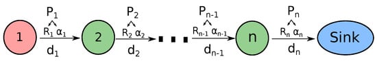 Multi-hop line network model. The PDR of link i, between nodes i and , is with parameters , and its length is .