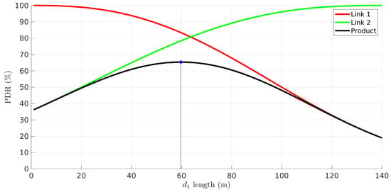 Generally, with n links we can represent the PDR solution in an n-dimensional graph. Thus, in this case, we can illustrate it with a 2D plot (Figure 3). The figure shows the PDR of the network (indicated as “product”) and of both links as a function of the position of the relay with respect to the source node, i.e., the length of the first link. The network length, , is the position of the source, considered fixed. The network PDR has a maximum at m, contradicting, for example, the intuition that it would be maximized at the point that equalizes the links’ PDR (∼63 m).