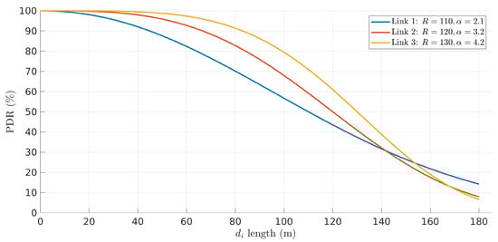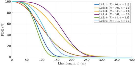 PDR models of six links as a function of link length , where link i connects nodes i and , .