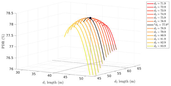 With three links, we can still visualize the result with a 3D plot. Figure 5 shows the network PDR as a function of the lengths of the first two links, constrained by . For each value of we obtain one two-dimensional PDR curve similarly to the product curve in Figure 3. The black curve represents the one that contains the highest peak, which is the maximum network PDR, achieved when m.