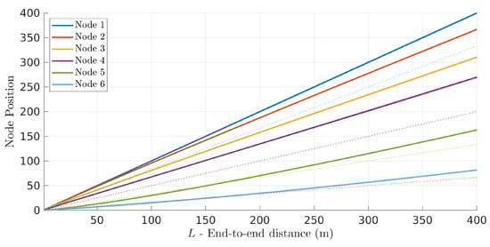 Figure 7 shows the optimal positions of the six UAVs for different network length L (solid lines) together with the corresponding equidistant positions (dashed lines). Node 1 corresponds to the source UAV and nodes 2 to 6 are the following five relay UAVs. Curiously, the curves also show what the path of all relay nodes would be in case they kept their optimal/equidistant positions tightly while the source (node 1) moved linearly away from the sink.