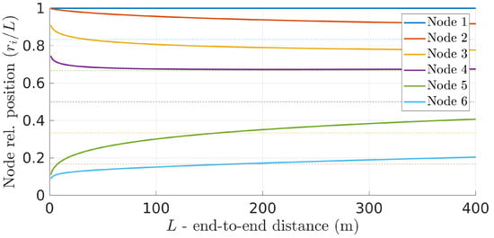 The absolute difference between optimal and equidistant positions increases nonlinearly with network length. This can be better observed when plotting the relative positions of the relays concerning the fraction of the total network length instead of the absolute positions (Figure 8). The figure clearly shows that the optimal relative positions are not kept constant as the network length increases. This means that applying simple rules to maintain the relative position of each relay to their neighbors is not optimal as the network changes its overall length. In this case, the optimal positions have to be dynamically recomputed.
