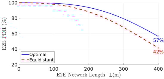 Looking now into the network PDR achieved with the optimal relays placement we can see a significant improvement when compared to what would be achieved with an equidistant placement instead, especially when the network increases its length. This is shown in Figure 9. In this particular example, when the network is 400 m long, using the optimal solution increased the PDR by 15 percentage points, regarding equidistant placement. This represents a performance improvement of (from to ). Note that the network (end-to-end) PDR when the relays are placed equidistantly, i.e., with , can be computed using Equation (16).
