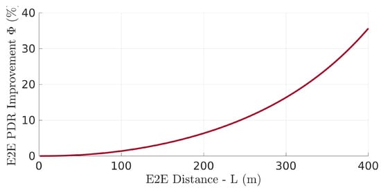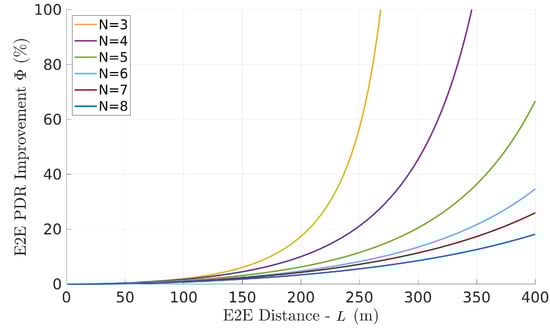 The performance improvement, in network PDR, as a function of the network length L is shown in Figure 10. In particular, we show the relative PDR gain (Equation (17)) represents the additional PDR obtained with the optimal relay positioning relative to the network PDR obtained with equidistant relays.