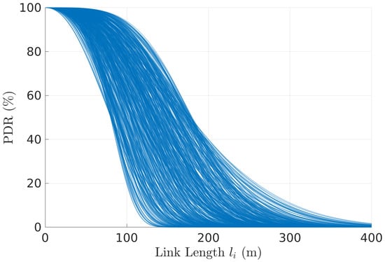 We started by generating a vast pool of links, where each link is generated with a random pair , taken uniformly from and , ranges that we observed in practice [,]. The PDR link models are shown in Figure 11.