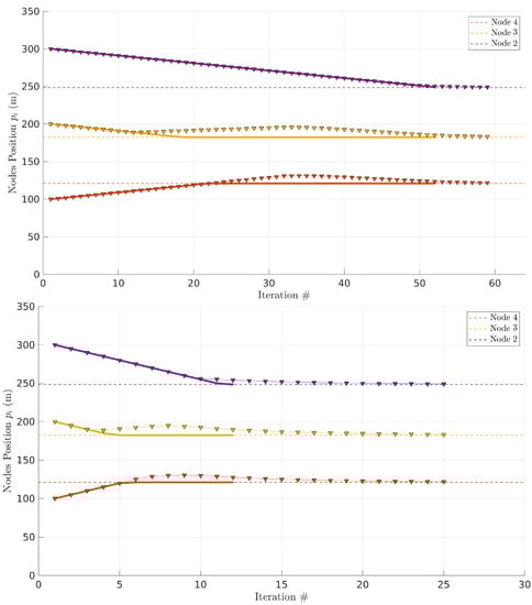 Figure 13 shows the same case with four links (), thus three relays, where the link PDR models were generated randomly (). The source node is fixed at m from the base station and the initial positions of the three relays are equidistant ( m, m, and m, respectively). The horizontal axis shows the number of iterations of the algorithm, repeated with a period of s (top) and s (bottom). The vertical axis represents the position of each relay along the line between source and base station.