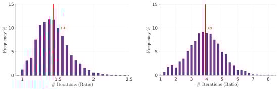 At this point, we have not achieved a formal proof of convergence for the distributed approach, yet. Thus, we tested the convergence hypothesis empirically using 10,000 random scenarios from the same pool of random link PDR models used in Section 4.2.2. In each scenario, we compare the time (and track the number of iterations) necessary for the centralized and distributed approaches to converge. We consider two cases with different periods ( s).