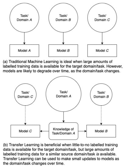 The difference between traditional ML (a), in which a new model is trained on a each domain/task pairing from random initialization, and TL (b), in which prior knowledge learned on one domain/task is used to support performance on a second domain and/or task where less (or no) labelled data were available.