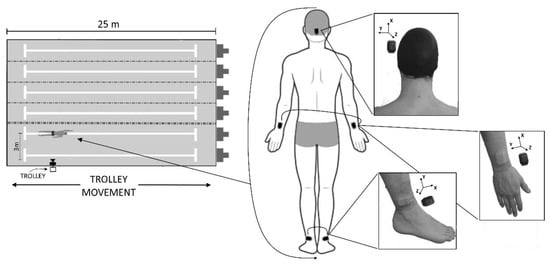Single sagittal camera on trolley followed the athlete at similar velocity during 100 m front-crawl swimming (left). Positioning of wearable inertial sensors on head, wrist, and ankle (right). Alignment of axes (X, Y, and Z) of reference system are shown for each position.