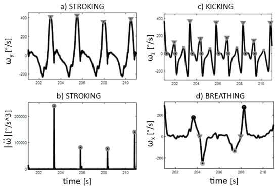 A typical pattern of four strokes for one swimmer. Stroking events using the wrist IMU: (a) angular velocity of Y axis with maximum for recovery phase identification (grey triangle); (b) modulus of the angular jerk with maxima for WRISTENTRY (grey circles). Kicking events using the ankle IMU: (c) angular velocity of Z-axis with propulsive (grey triangle) and buoyancy (grey cross) kicking, and zero-crossing for LEGDOWNBEAT (grey circles). Breathing events using the head IMU: (d) angular velocity of X-axis with zero-crossing (grey triangle) between maximum/minimum (black/grey circle) for HEADEXIT and HEADENTRY (before and after zero-crossing maximum/minimum events, respectively).