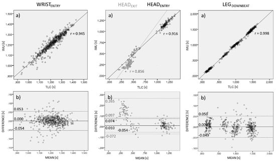 Linear regression analysis (a) and Bland–Altman plots (b) for WRISTENTRY (open circles), HEADEXIT (grey filled circle), HEADENTRY (open circle), and LEGDOWNBEAT (open circle) when comparing measurements with IMUs and video-based technique (TLC). In (b), central lines represent the intermethod differences (biases). Upper and lower dotted lines represent the 95% limits of agreement (bias ± 1.96 SD of the differences).