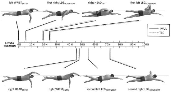 The average timing of the analyzed temporal events in percentage of the stroke duration are reported in Table 1. Regarding timing, the respective average RMSEs and 90th percentile of absolute errors for IMU vs. TLC were 0.1 and 1.5% for WRISTENTRY, 0.7 and 8.0% for HEADEXIT, 0.1 and 2.2% for HEADENTRY, and 0.1 and 1.8% for LEGDOWNBEAT. The respective CVs for IMU and TLC were 0.0 and 0.0 for WRISTENTRY, 0.4 and 0.1 for HEADEXIT, 0.0 and 0.0 for HEADENTRY, and 0.1 and 0.1 for LEGDOWNBEAT. The respective TEMs for IMU and TLC in percentage of the stroke duration were 2.2 and 2.1 for WRISTENTRY, 4.6 and 3.2 for HEADEXIT, 1.5 and 1.3 HEADENTRY, and 2.0 and 1.6 for LEGDOWNBEAT. The mean biases of timing between measurement techniques were −0.2% for WRISTENTRY (LoA: −2.3 to 1.9%), 4.1% for HEADEXIT (LoA: −3.1 to 11.2%), 0.3% for HEADENTRY (LoA: −1.9 to 2.5%) and 0.5% for LEGDOWNBEAT (LoA: −1.4 to 2.3%). The timings of the analyzed temporal events in percentage of the stroke duration using IMUs and TLC for a single participant are reported in Figure 4.