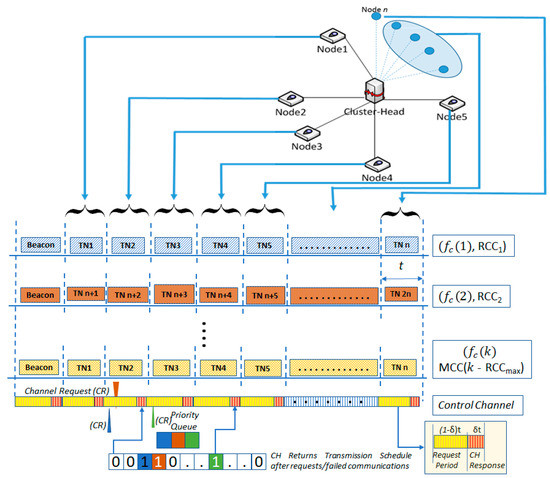 where is the number of frequency channels, channels are used in the superframe and is the communication failure probability for the channel . The average communication failure is normalized with the number of channels which is k, as expressed in Equation (2). All channel communications are synchronized, where a synchronization beacon is issued at the start of every superframe. In addition, a control channel is also introduced, which allows the IoT devices belonging to high priority/vulnerable patients/systems to either request communication resource or CH reschedules their retransmission as needed. However, a more frequent practice, where the CH automatically reschedules communications of high priority nodes, is considered for evaluation purposes.