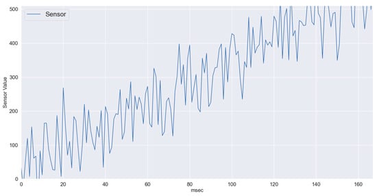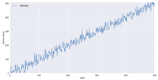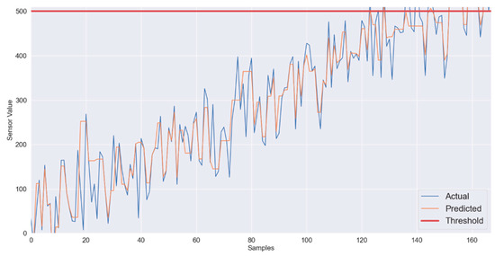 Figure 3 shows linearly changing sensory data. In periodically reported patient’s vitals using IoT, at first relatively slow changing data were considered where the change from normal sensory input to critical sensory input takes around 500 ms. In the IoT framework with superframe duration of 10 ms, over 50 samples from the sensor are expected to be communicated to the CH. Even if the wireless channel becomes highly unstable, the proposed gradient boosting regression running at the CH manages to predict the values with sufficient accuracy. In Figure 4, three series are presented, i.e., actual values or ground truth labels, the predicted labels obtained through the XGB classifier, and the threshold. The threshold presented identifies the critical threshold values for the sensor readings and if exceeded represents the equivalence of medical emergency. It is to illustrate how quickly the system will be able to detect/predict patients’ sensory traces violating the threshold. The mean absolute error obtained for this scenario is 3.47.