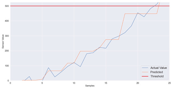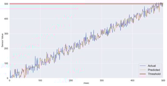 To investigate the suitability of the proposed machine learning algorithm further, rapidly changing sensory data were also considered which are presented in Figure 5 and Figure 6. Here the sensory data are changing linearly as well, but the change from normal to critical takes place in only 250 ms. In Figure 6, three series represent actual values, predicted labels and the threshold values. The mean absolute error obtained for the scenario in Figure 6 is 5.04. As shown, in Figure 6, the XGB based regression algorithm also predicts this rapidly changing sensory data very effectively.