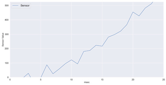 Finally, the exponentially changing sensory data are evaluated as presented in Figure 7 and Figure 8. While the fluctuation in the sensory data providing a patient’s vitals changes rapidly from normal to critical, the XGB still manages to predict the data effectively. The MAE obtained between the actual and predicted values (using XGB) for the scenario in Figure 8 is 15.53. Since the sensory data change is simulated to be exponential in nature, the change in sensory data from normal to critical only takes around 22 ms. However, as shown in Figure 8, the predicted results are still very close to the actual values, thus enabling an accurate prediction of a patient’s sensory data fluctuation. This not only enables early prediction of any change in a patient’s health and vitals but also allows intermittent service failure of IoT networks to be overcome. The evaluation of results for slow as well as rapidly changing data also reveals that it is possible with the proposed regression algorithm to track the changes accurately.